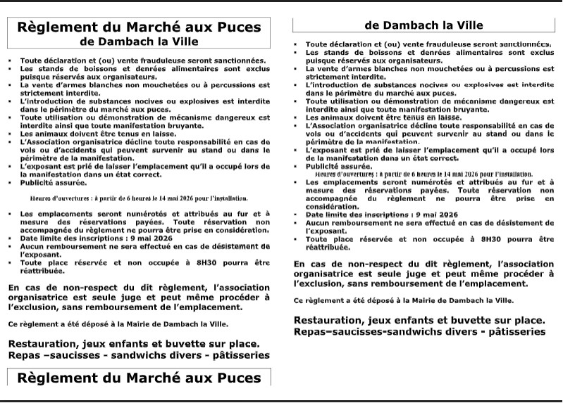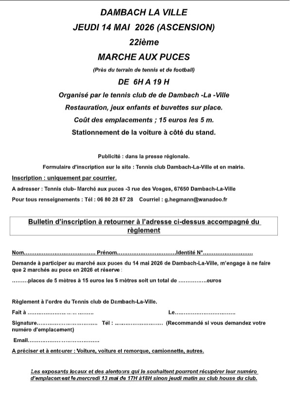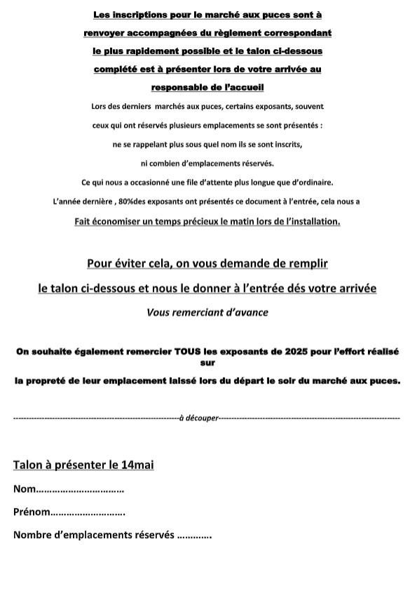 Bulletin d’inscription de notre 22ième marché aux puces le Jeudi 14 Mai 2026 (Ascension) Fiche d’inscritpion à télécharger pour imprimerTélécharger Talon à présenter le 14 Mai à télécharger pour imprimerTélécharger Publié le février 10, 2026 - Actualités