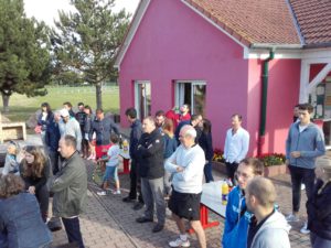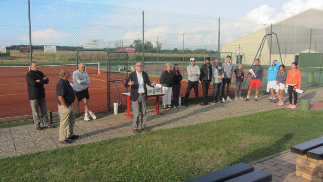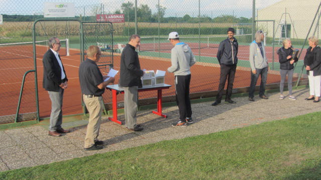 Le président d’honneur Gérard H informe que les travaux d’éclairage des 2 terrains vont démarrer en octobre pour se terminer en mai prochain ce qui va permettre un meilleur déroulement des rencontres au tournoi d’été. Il annonce également une bonne nouvelle : le club atteint les 300 membres en 2017.   Il fait remettre les prix aux vainqueurs et finalistes avec son humour habituel, remercie Gaétan et Jean Marc et invite tous au vin d’honneur et aux tartes flambées.