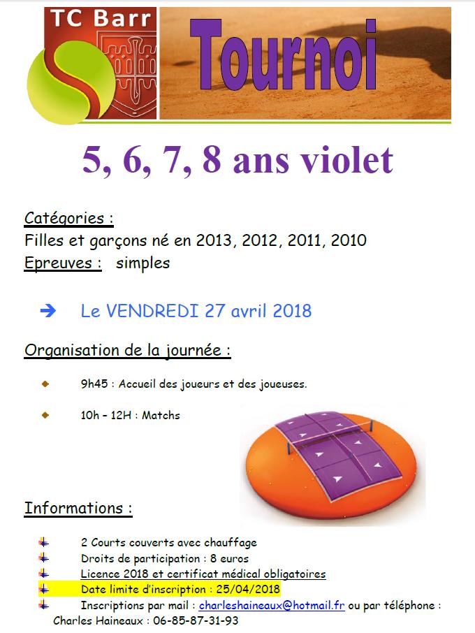 Un tournoi violet aura lieu le vendredi 27 avril 2018 de 10H à 12H au TC Barr.